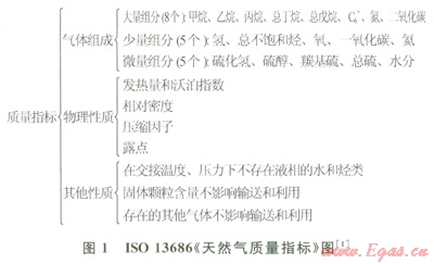 國際標(biāo)準(zhǔn)化組織(ISO)于1998年發(fā)布ISO13686《天然氣質(zhì)量指標(biāo)》,成為全世界天然氣質(zhì)量控制的指導(dǎo)性準(zhǔn)則和各國之間簽訂天然氣貿(mào)易合同的指南。該國際標(biāo)準(zhǔn)明確規(guī)定了天然氣質(zhì)量必須滿足安全衛(wèi)牛、環(huán)境保護、經(jīng)濟利益3個方面要求。其對天然氣質(zhì)量控制參數(shù)、測量單位和測量方法標(biāo)準(zhǔn)進(jìn)行了規(guī)定(圖1) [1]。