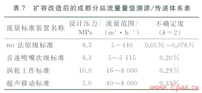 在現(xiàn)有天然氣流量量傳溯源體系的基礎(chǔ)上,通過成都分站的擴容改造,進(jìn)一步提高技術(shù)水平和能力,躋身國際先進(jìn)行列。成都分站擴容改造后,將建立中低壓(0.3~6.0MPa)、質(zhì)量流量不確定度為0.05%~0.076%的原級標(biāo)準(zhǔn)裝置。新建的環(huán)道檢測系統(tǒng)作為工作標(biāo)準(zhǔn),將現(xiàn)有臨界流文丘里噴嘴次級標(biāo)準(zhǔn)裝置從不確定度0.33%水平提高到小于等于0.20%(表7)。
