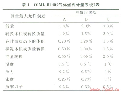 國際法制計量組織(OIML)于l998年發(fā)布Rl40《氣體燃料計量系統(tǒng)》[2],作為天然氣流量計量的指導(dǎo)性準(zhǔn)則和各國簽訂天然氣貿(mào)易合同的指南。該技術(shù)文件對天然氣流量計量系統(tǒng)準(zhǔn)確度等級和能量、質(zhì)量、體積、參數(shù)換算、壓力、溫度、密度、壓縮因子的測量最大允許誤差等技術(shù)要求進(jìn)行了詳細(xì)規(guī)定(表1) [2]。