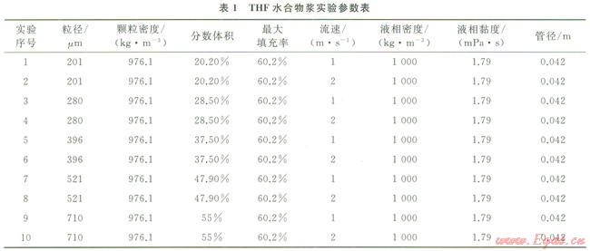 王武昌等[11]對四氫呋喃(THF)水合物在水平管道中的流動狀態(tài)進行了大量實驗研究(表1),研究內(nèi)容包括顆粒粒徑、濃度以及流速等對水合物漿流動狀態(tài)的影響,筆者以其實驗數(shù)據(jù)為參照,對模型計算結(jié)果進行了對比。