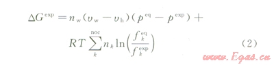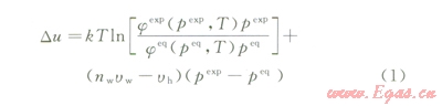 式中Du為過飽和度,J;DGexp為吉布斯自由能的變化量;pep為相平衡壓力,MPa;pexp為實(shí)驗(yàn)條件下的壓力,MPa;R為氣體常數(shù),kJ/(mol·K);T為系統(tǒng)溫度,K;k為波爾茲曼常數(shù);nw為水合數(shù);uw為水分子的體積,m3;uh為單個(gè)水合物晶胞的體積與平衡壓力下所含有的氣體分子數(shù)的比值,m3;nk為氣體分子的數(shù)量;¦keq為相平衡條件下k組分氣體的逸度系數(shù);¦kexp為實(shí)驗(yàn)條件下k組分氣體的逸度系數(shù);jeq為相平衡條件下氣體的逸度系數(shù);jexp為實(shí)驗(yàn)條件下氣體的逸度系數(shù)。