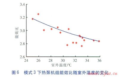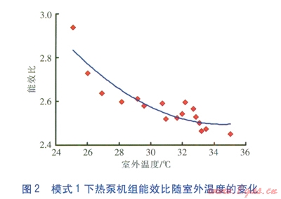 模式1下熱泵機組制冷性能系數(shù)隨室外溫度的變化見圖l,圖中紅色點為實測數(shù)據(jù)點,平滑曲線為擬合曲線:ICOP=0.0046q2-0.3224q2+8.2426,q為室外溫度(單位為℃)。由圖1可知,模式1下熱泵機組制冷性能系數(shù)隨室外溫度的升高而降低,且下降速率較快。這說明空氣源熱泵的性能易受室外溫度影響,當室外溫度升高時,冷凝器的工作環(huán)境惡化,制冷劑甚至不能及時液化,直接導致熱泵機組的制冷性能系數(shù)下降。模式l下熱泵機組能效比隨室外溫度的變化見圖2,圖中紅色點為實測數(shù)據(jù)點,平滑曲線為擬合曲線:IEER=0.0038q2-0.2606q+7.0016。由圖1、2可知,模式1下熱泵機組能效比隨室外溫度的升高而降低,變化趨勢與制冷性能系數(shù)基本一致。