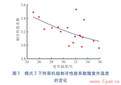 對于模式l,熱泵機組的制冷性能系數(shù)、能效比不高,且隨著室外溫度升高下降速率較快。對于模式2,熱泵機組的制冷性能系數(shù)、能效比較高,但隨著運行時間的延長下降速率較快。對于模式3,熱泵機組的制冷性能系數(shù)、能效比水平處于模式1與模式2之間,但隨著室外溫度的升高下降趨勢不明顯。因此,風冷—水冷冷凝器聯(lián)合運行,對熱泵機組在長時間運行過程中保持較高性能有幫助。而且可平衡地埋管換熱器向土壤的釋熱、吸熱量,保持熱泵系統(tǒng)長期有效運行。