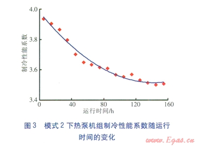 模式2下熱泵機組制冷性能系數(shù)隨運行時間的變化見圖3,圖中紅色點為實測數(shù)據(jù)點,平滑曲線為擬合曲線:ICOP=2×10-5t2-0.0065t+3.981,t為運行時間(單位為h)。由圖3可知,模式2下,雖然熱泵機組制冷性能系數(shù)隨運行時間的延長呈下降趨勢,且下降速率較快,但有趨于平穩(wěn)的趨勢。模式2下熱泵機組能效比隨運行時間的變化見圖4,圖中紅色點為實測數(shù)據(jù)點,平滑曲線為擬合曲線:IEER=2×10-5t2-0.0066t+3.3975。由圖3、4可知,模式2下熱泵機組能效比與制冷性能系數(shù)的變化趨勢基本一致。