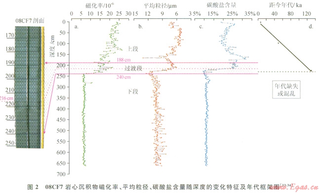 08CF7巖心在琴叁和取樣過程中未遭到人為破壞,且未見明顯生物擾動痕跡,因此能較好地指示其原位沉積特征。巖心觀察發(fā)現(xiàn),沉積物白頂向下以216cm處為界,上部為灰黑色,下部為淺黑色,交界面呈相互穿透狀,整段巖心的沉積物類型均為黏土質(zhì)粉砂。筆者在前期的研究中已對巖心沉積物進(jìn)行粒度、磁化率和碳酸鹽含量測定和分析[34-35],將結(jié)果進(jìn)行綜合對比和分析,發(fā)現(xiàn)這3項(xiàng)指標(biāo)均呈現(xiàn)出相似的變化趨勢,可分為3段:①0~188cm段,各項(xiàng)指標(biāo)變化較大,以磁化率值高,沉積物粒度小及碳酸鹽含量高為特征;②188~240cm段,為各項(xiàng)指標(biāo)和沉積物巖性變化的過渡段;③240cm以下,各項(xiàng)指標(biāo)呈現(xiàn)均一性變化,相對以磁化率值低,沉積物較粗及碳酸鹽含量低為特征(圖2)。