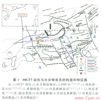 08CF7站位位于南海北部神狐海區(qū)。該海區(qū)位于南海北部陸坡中段,界于兩沙海槽和東沙群島之間,構(gòu)造上處于珠江口盆地珠Ⅱ凹陷,自中新世以來進(jìn)入構(gòu)造沉降[30]。新生代沉積厚度介于1000~7000m,有機(jī)質(zhì)含量為0.2%~l.9%[5,29]。水深800~2000m,海底地形復(fù)雜且坡度變化較大。高分辨率地球物理調(diào)查表明,該海域廣泛發(fā)育斷裂一褶皺體系、泥火山、泥底辟等構(gòu)造,且海底以下150~350m廣泛分布BSR,具有較好的水合物形成和賦存的地質(zhì)條件 [5,18,21],且于2007年在該海區(qū)成功鉆取到水合物實(shí)物樣品[31]。