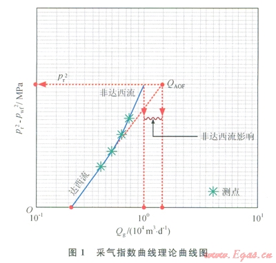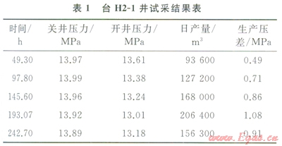 接著用采氣指數(shù)法對該井進行滲流動態(tài)描述[3]。該方法主要根據(jù)滲流力學原理,將氣體滲流控制在達西流的范圍內(nèi),以達到保護儲層、避免出砂的目的。根據(jù)臺H2-1井的試采數(shù)據(jù),其臨界點在生產(chǎn)壓差lMPa(即地層壓力的7%左右),在此生產(chǎn)壓差下其日產(chǎn)量為16×104m3,也即理論上的最高配產(chǎn)量(圖1)。