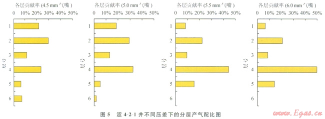 該技術需要首先進行地質(zhì)研究,根據(jù)地層系數(shù),得到各層理論產(chǎn)出配比情況。研究結果認為:4、5號層為該井的主力氣層。然后根據(jù)不同工作制度序列,進行產(chǎn)氣剖面測試,獲得不同壓差下的分層相對產(chǎn)氣配比情況(圖5)。