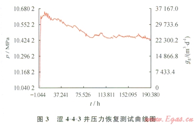 如澀4-4-3井,2008年6月關井測壓力恢復曲線(圖3)。關井期間,套管處于開井生產(chǎn)狀態(tài),從壓力曲線上看,關井初期壓功處于上升趨勢,從關井l.5h后開始壓力處于上下波動中,但整體上處于下降趨勢,判斷油套密封性不嚴。