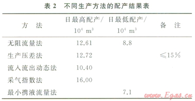 氣井的最小攜液產(chǎn)量也是配產(chǎn)的重要考慮參數(shù)。該參數(shù)用以保證氣井生產(chǎn)時井筒不產(chǎn)生積液。臺H2-1井分別采用73mm、60.3mm、48.3mm這3種規(guī)格的油管進行模擬計算,得出其最小臨界攜液日產(chǎn)量分別為7.1×104m3、4.9×104m3和3.2×104m3。目前該井使用的為73mm油管,確定其最小臨界攜液流量為7.1×104m3/d。通過以上幾種方法配產(chǎn)方法,其匯總結果如表2所示。