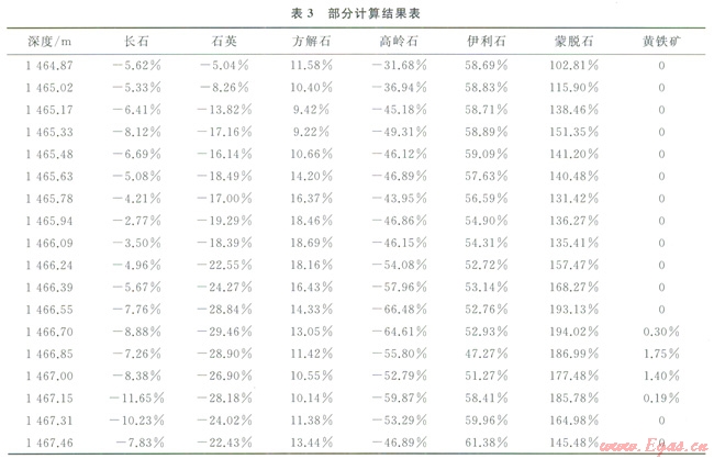 從表3中可以看出該結(jié)果中多種礦物含量為負值,且有的礦物含量為大于l00%的值,這樣的結(jié)果顯然是不合理的。經(jīng)分析檢驗,修正后的轉(zhuǎn)換系數(shù)矩陣條件數(shù)較大,為病態(tài)方程組,所以用一般的數(shù)值解法會有較大的誤差,甚至嚴(yán)重失真。所以需要根據(jù)本地區(qū)巖心的資料對轉(zhuǎn)換系數(shù)做更進一步的校正。