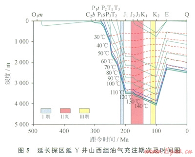 山西組砂巖中流體包裹體的測(cè)溫結(jié)果表明:①延長(zhǎng)地區(qū)上古生界山西組至少存在3期流體活動(dòng),第Ⅰ期流體活動(dòng)的主峰溫度在85~90℃,規(guī)模較小;第Ⅱ期流體活動(dòng)的主峰溫度在115~120℃,這期流體形成了大量石英加大邊;第Ⅲ期流體活動(dòng)的主峰溫度在135~155℃,流體規(guī)模較大。②高于l65℃的樣品點(diǎn)34個(gè),溫度范圍較分散。③從測(cè)點(diǎn)數(shù)日來看,110~165℃區(qū)間內(nèi)的數(shù)據(jù)點(diǎn)較多,共計(jì)482個(gè)。在3期流體活動(dòng)中均檢測(cè)到含烴包裹體,因此推測(cè)其與油氣充注有關(guān)。將流體包裹體的均一溫度投影在單井埋藏史圖上(圖5),發(fā)現(xiàn)3期油氣充注分別發(fā)生在晚三疊世、中晚侏羅世和早白堊世。