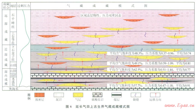 1)延長(zhǎng)探區(qū)處于鄂爾多斯盆地東南部,與盆地北部一樣,具有“廣覆式生烴、大面積成藏”的特點(diǎn)。本溪組—山2段暗色泥巖與煤系地層是主力生烴層系;儲(chǔ)層砂體發(fā)育,多層系砂體垂向疊置橫向連片,加上構(gòu)造不發(fā)育,是形成大面積復(fù)合巖性圈閉的重要條件;上石盒子—石千峰組發(fā)育巨厚的泥巖具有物性和壓力雙重封閉性能;砂體與裂縫是主要輸導(dǎo)體系,天然氣運(yùn)移以垂向運(yùn)移為主。