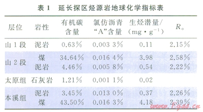 延長(zhǎng)探區(qū)上古生界烴源巖為海陸交互相暗色泥巖、煤層及生物屑灰?guī)r,層位主要分布于下二疊統(tǒng)山西組、中石炭統(tǒng)本溪組和上石炭統(tǒng)太原組,平面分布穩(wěn)定,其中山西組泥巖厚度介于70~80m,煤層厚度介于l~7m,主要分布于山2段;太原組石灰?guī)r厚度介于10~40m,本溪組泥巖厚度介于l5~35m,煤層厚度介于1~6m。從地球化學(xué)指標(biāo)來看(表1),山l段泥巖生烴條件較差,平均有機(jī)碳含量?jī)H為0.63%,山2段和本溪組較好,其泥巖有機(jī)碳含量大于3%,煤層有機(jī)碳含量大于30%;太原組石灰?guī)r有機(jī)碳含量為1.21%,氯仿瀝青“A”含量和生烴潛量指標(biāo)均較低。上述情況表明:該區(qū)主力烴源巖為山2段和本溪組暗色泥巖及含煤層系。該區(qū)上占生界烴源巖鏡質(zhì)體反射率(R。)為1.59%~2.65%,普遍超過2%,處于過成熟干氣階段,生烴強(qiáng)度在28×108~40×108m3/km2。生烴量大,氣源充足,具有“廣覆式”生烴特征[3-9]。