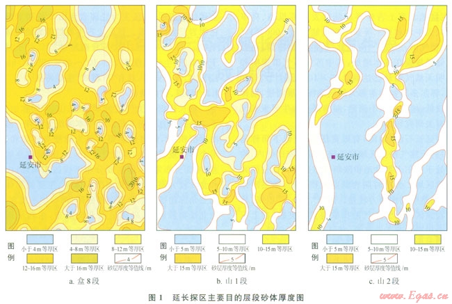 延長(zhǎng)探區(qū)主力氣層為本溪組、山23層和山1段、下二疊統(tǒng)石盒子組8段。其中本溪組為潮坪—障壁島海岸沉積[10],儲(chǔ)集體類型主要為障壁島砂壩和砂坪,單個(gè)砂體規(guī)模較小,厚度介于2~10m,橫向連續(xù)性較差,平面分布零散,但主要分布于探區(qū)東南部;山西組和盒8段為湖泊—三角洲沉積體系,主要儲(chǔ)集體類型為三角洲前緣水下分流河道砂體,河口壩不發(fā)育,受盆地北緣物源影響,砂體呈南北向展布,東西呈透鏡體狀,厚度介于4~20m,其中盒8段砂體最為發(fā)育,分布范圍廣,厚度大(圖1)。各層位砂體垂向疊置,橫向連片,形成大面積復(fù)合砂體帶,是該區(qū)儲(chǔ)層砂體空間展布的基本特征。