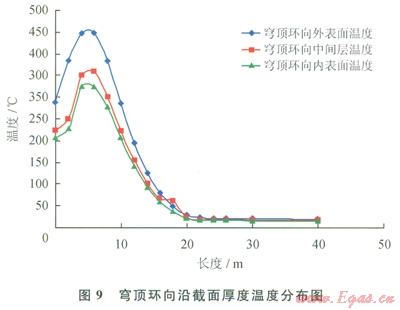 穹頂混凝土的外表面溫度無論是徑向還是環(huán)向,最高溫度均在450℃左右。內(nèi)外表面溫度相差l00℃左右,將產(chǎn)生較大的溫度應(yīng)力(圖8、9)。