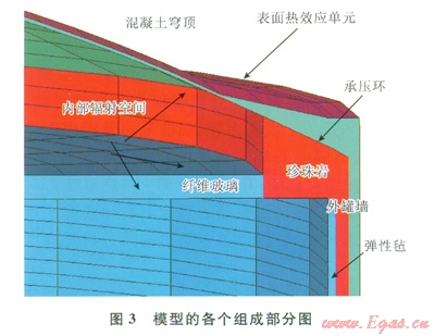 儲(chǔ)罐瞬態(tài)熱力分析模型包含穹頂和混凝土外罐墻。局部還有結(jié)構(gòu)的鋼內(nèi)襯板、玻璃纖維彈性氈、珍珠巖保溫材料和鋼筋混凝土承壓環(huán)。其穹頂厚度約為400mm。