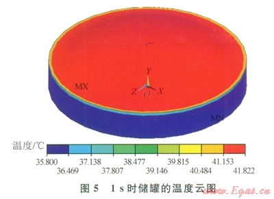 1s時(shí)的溫度分布可以看到穹頂已經(jīng)獲得了初始的熱邊界條件,穹頂外表面是夏季最熱天的環(huán)境溫度41℃(圖5)。