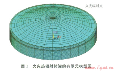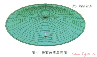 其中承壓環(huán)及襯板用shelll31單元建立、其他部分可用實(shí)體單元solid70。有限元模型求解的是連續(xù)體問題,但在此模型中,安全閥的位置離穹頂約16m,是非連續(xù)孤立的節(jié)點(diǎn)。為了能讓安全閥的熱輻射能傳遞到穹頂。必須借助一類特殊的單元即表面效應(yīng)單元,實(shí)現(xiàn)孤立火災(zāi)點(diǎn)和儲(chǔ)罐各個(gè)部分的熱輻射。