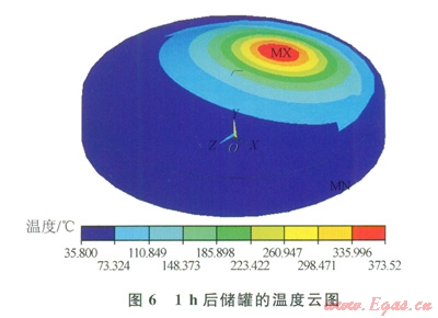 安全閥的熱輻射條件是根據(jù)相關(guān)國(guó)外規(guī)范[14],熱輻射能量為32kW/m2,安全閥高度離穹頂約l6m,持火燃燒6h?;馂?zāi)熱輻射是瞬態(tài)熱分析,即熱輻射隨著時(shí)間發(fā)生的。為了建立有限元模型的初始條件,在火災(zāi)將要發(fā)生的ls時(shí),執(zhí)行穩(wěn)態(tài)熱分析,得到儲(chǔ)罐的溫度分布情況。然后從1s~6h考慮安全閥火災(zāi)的瞬態(tài)熱輻射,給安全閥孤立節(jié)點(diǎn)施加熱輻射能量,使儲(chǔ)罐獲得相應(yīng)的背景輻射溫度。模型還要考慮通風(fēng)情況下的強(qiáng)制對(duì)流,施加根據(jù)努賽爾系數(shù)計(jì)算得出的對(duì)流換熱系數(shù),并考慮外部環(huán)境溫度的約束條件。