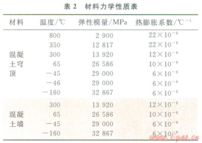 在外界溫度變化下,儲(chǔ)罐內(nèi)的LNG達(dá)到沸點(diǎn)蒸騰,從而產(chǎn)生氣壓。為保護(hù)混凝土外罐免受不斷增加的氣壓作用,需通過穹頂上部的安全閥將超壓的LNG蒸氣排出。在此過程中,LNG蒸氣或被點(diǎn)燃發(fā)生火災(zāi)。在這種偶然工況下,國(guó)內(nèi)現(xiàn)有的混凝土規(guī)范尚無規(guī)定,而國(guó)外的ENl473等規(guī)范僅給出一般性的條款,沒有具體的計(jì)算公式。所以發(fā)生安全閥火災(zāi)時(shí),儲(chǔ)罐各部位的溫度怎么分布?火災(zāi)導(dǎo)致的混凝土熱應(yīng)變是否達(dá)到了極限應(yīng)變等,這些需借助大型有限元軟件進(jìn)行詳細(xì)的熱力學(xué)分析才能得到,指導(dǎo)后續(xù)設(shè)計(jì)工作。