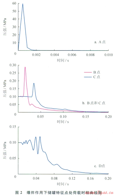 儲(chǔ)罐各特征點(diǎn)處在爆炸作用下的荷載時(shí)程曲線如圖2所示,由于E、F兩點(diǎn)距離爆心較遠(yuǎn),其超壓現(xiàn)象不明顯,本文并未示出這兩點(diǎn)的相應(yīng)曲線。比較前3個(gè)特征點(diǎn)的荷載時(shí)程曲線,其極值分別為59.15MPa、0.28MPa和0.18MPa;峰值出現(xiàn)時(shí)間分別為0.5ms、15.1ms和35ms;正壓區(qū)作用時(shí)間分別為2ms、8ms和10.5ms。本文參考文獻(xiàn)[14]中給出了裝藥密度為1630kg/m3時(shí)TNT炸藥所形成空氣沖擊波的初始值,其初始波后壓力為54.35MPa,傳播速度為6450m/s.