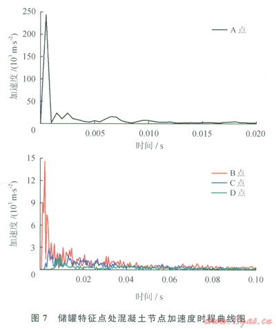 圖7為儲(chǔ)罐特征點(diǎn)A~D處混凝土節(jié)點(diǎn)加速度時(shí)程曲線。由圖7可見,各點(diǎn)加速度峰值均出現(xiàn)在初始加載階段,而后反應(yīng)大幅下降,并伴有鋸齒形劇烈振蕩,振蕩現(xiàn)象隨著爆心距的增加而愈加劇烈。這一現(xiàn)象的原因?yàn)檎ㄋ幈ê蠼o儲(chǔ)罐穹頂一個(gè)極大的初始加速度荷載,引起各特征點(diǎn)處加速度出現(xiàn)一個(gè)脈沖峰值,而后出現(xiàn)的鋸齒形振蕩則是由儲(chǔ)罐的自振引起的。將圖5~7與圖2的荷載時(shí)程曲線相對(duì)比,叮以看出,沖擊波波陣面的傳播對(duì)混凝土單元的應(yīng)力影響很大,但對(duì)于其加速度響應(yīng)影響不大。以C點(diǎn)為例,其荷載峰值出現(xiàn)在35ms處,此時(shí)其相應(yīng)的應(yīng)力出現(xiàn)了一個(gè)脈沖峰值,而其加速度響應(yīng)未有明顯波動(dòng)。