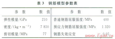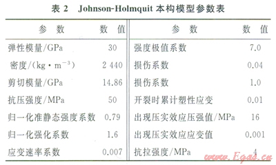 混凝土采用Johnson-Holmquit本構(gòu)模型,模型參數(shù)見表2。該模型因綜合考慮了損傷、應(yīng)變率、靜水壓以及壓碎、壓實(shí)效應(yīng),適合大應(yīng)變、高應(yīng)變率和高靜水壓情況,被廣泛地應(yīng)用于混凝土撞擊、侵徹和爆炸等強(qiáng)動(dòng)載問題的數(shù)值模擬。鋼筋材料模型采用雙線性隨動(dòng)硬化模型,用兩個(gè)斜率(彈性和塑性)來表示鋼筋的應(yīng)力應(yīng)變特性,具體參數(shù)見表3。