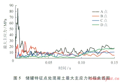 C點(diǎn)在4.5ms時(shí)也出現(xiàn)了一個(gè)l0.7MPa的脈沖峰值,原因同上;在24.8ms出現(xiàn)一個(gè)ll.9MPa的峰值響應(yīng),是由于空氣沖擊波波陣面?zhèn)鞑サ?span lang="EN-US">C點(diǎn)所致,其后應(yīng)力急劇下降并伴有高頻鋸齒振蕩[16]。從圖5中可以看出D點(diǎn)在80ms以前應(yīng)力持續(xù)小幅振蕩,80ms以后為大幅低頻響應(yīng),如3.1節(jié)中所述,這一現(xiàn)象與其特殊的位置和構(gòu)造有關(guān),爆炸沖擊波在此處連續(xù)作用于罐體,導(dǎo)致罐體疲勞損傷??傮w來說,A、B點(diǎn)雖未發(fā)生破壞,但均已處于較高的應(yīng)力水平,C點(diǎn)至F點(diǎn)混凝土的應(yīng)力響應(yīng)均在安全范圍之內(nèi),這也印證了前述900kg當(dāng)量為罐體抗爆極限值的結(jié)論。