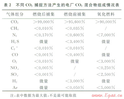 電力行業(yè)是主要的CO2排放源。電廠CO2捕捉的3個主要方法是:①燃燒前捕集;②燃燒后捕集;③氧化燃料。使用不同CO2捕捉方法所產(chǎn)生的CO2混合氣體雜質(zhì)含量也不同。采用不同CO2捕捉方法得到的典型CO2混合氣體組成情況見表2[2]。CO2混合氣體的組分含量取決于多個因素,如果對其他化合物不進(jìn)行純化和聯(lián)合捕捉就會達(dá)到表2中的最大濃度。通常最終CO2混合氣體中的H2S和SO2含量遠(yuǎn)低于表2所示的最大濃度。