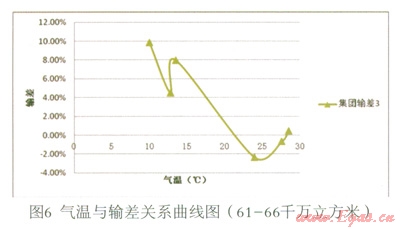 (3)在現(xiàn)有數(shù)據(jù)基礎(chǔ)上,暫未發(fā)現(xiàn)供氣量與輸差之間的明顯函數(shù)關(guān)系。但是,從圖8觀察發(fā)現(xiàn),輸差曲線1、2、3(修正)對應(yīng)的供氣量依次為:41—45、56—60、61—66,單位千萬立方米。隨著供氣量的大幅上升,輸差曲線呈向左下方平移的趨勢。即溫度等其他條件一定的情況下,隨著供氣量的大幅增加,輸差有減小的趨勢。初步分析,可能是由規(guī)模效應(yīng)導(dǎo)致。此推斷是否成立有待進(jìn)一步的研究,可做為下一研究課題。