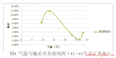 將數(shù)據(jù)按供氣量相近的原則分組(共分為3組:41—45、56—60、61—66,單位千萬立方米),每一組按氣溫升序排列。每組內(nèi)部近似忽略供氣量的影響,得到供氣量一定時,氣溫與輸差的關(guān)系曲線如圖4—圖6所示。