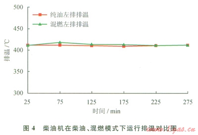 柴油機(jī)組在混合燃料狀態(tài)運(yùn)行時,機(jī)組運(yùn)行的各項參數(shù)與柴油機(jī)標(biāo)定參數(shù)相近,在啟動、關(guān)閉等過程,發(fā)動機(jī)運(yùn)行平穩(wěn),無異常。當(dāng)負(fù)荷過低時,機(jī)組混燃模式下的排溫略高于純柴油模式,但仍在安全范圍以內(nèi),不對柴油機(jī)組的運(yùn)行造成影響。