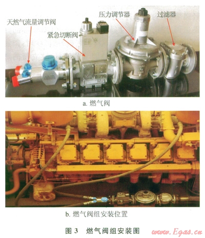 由天然氣流量調(diào)節(jié)閥、緊急切斷閥、壓力凋肯器和過濾器組成(圖3)。過濾器用于濾除天然氣中的污染物以保護(hù)系統(tǒng)和柴油機(jī);壓力調(diào)節(jié)器可以監(jiān)測柴油機(jī)負(fù)載增減引起的柴油機(jī)真空度變化,從而保持設(shè)定的天然氣進(jìn)氣壓力。緊急切斷閥內(nèi)部包含2個相互獨(dú)立的“常閉”狀態(tài)的閥門。天然氣流量調(diào)節(jié)閥用于控制給定負(fù)載時的天然氣流量,可用于設(shè)定天然氣/柴油替代率。
