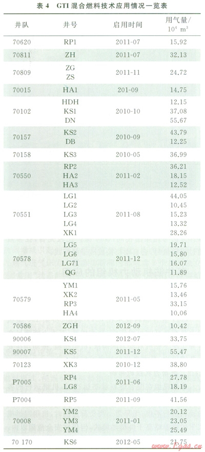 GTI混合燃料技術(shù)性能穩(wěn)定,安全性高,具有良好的經(jīng)濟(jì)效益。目前,GTI技術(shù)應(yīng)用21個鉆井隊,應(yīng)用井?dāng)?shù)40口,累計用氣量達(dá)935×104m3。GTI混合燃料技術(shù)應(yīng)用情況如表4所示。