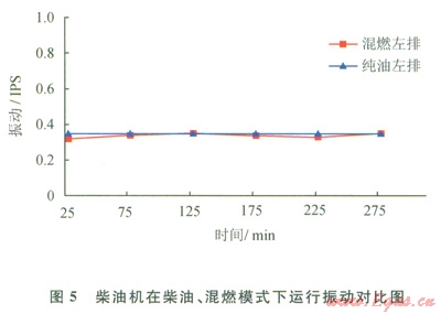 2)排溫和振動試驗分析。試驗功率為450kw,柴油機(jī)在柴油、混燃模式下運(yùn)行300min(替代率33.81%),排溫和振動[8-10]試驗結(jié)果相差不大(圖4、5)。