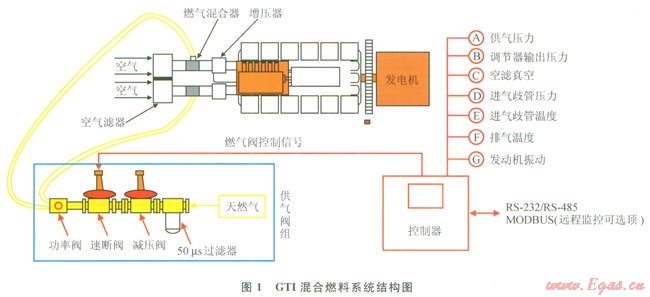 GTI混合燃料技術(shù)是利用美國Altronic公司生產(chǎn)的GTI混合燃料系統(tǒng)對柴油機(jī)進(jìn)行改造的技術(shù)[1]。經(jīng)GTI混合燃料技術(shù)改造的混合燃料發(fā)電機(jī)組,能夠同時燃燒柴油和天然氣。被改造的機(jī)組在啟動和怠速時按純柴油工作方式運(yùn)行,達(dá)到混燃條件后進(jìn)入混合燃料運(yùn)行模式。GTI混合燃料控制系統(tǒng)允許原柴油機(jī)監(jiān)控系統(tǒng)控制柴油機(jī)的轉(zhuǎn)速,在恒定的負(fù)載下,由于額外吸入了天然氣,柴油機(jī)燃料超出需要,柴油機(jī)的轉(zhuǎn)速輕微增加,為了保持熱值平衡和設(shè)定的轉(zhuǎn)速,監(jiān)控器會迅速調(diào)節(jié)減少噴油量,從而實(shí)現(xiàn)天然氣對柴油的替代。反之,當(dāng)已達(dá)平衡狀態(tài)后天然氣供給減少時,柴油機(jī)監(jiān)控器會迅速實(shí)時動態(tài)地調(diào)節(jié)噴油量,建立新的燃油供給平衡,保持設(shè)定轉(zhuǎn)速,維持柴油機(jī)正常運(yùn)行。