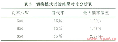4)切換模式對比分析。分別在500kW、600kW和650kW 3種工況下,進(jìn)行天然氣切斷時的響應(yīng)測試,最大頻率偏差2.27%,小于國家標(biāo)準(zhǔn)5%。分別在500kW(替代率55%)、600kW(替代率60%)和650kW(替代率65%)工況下,GTI機(jī)組頻率增加均沒有超過l%。試驗結(jié)果表2所示。