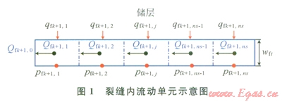 假設(shè)流體經(jīng)過裂縫面進入裂縫后向水平井筒的流動為一維線性流動(圖1)。為了便于計算,將微元段處理成矩形進行汁算,裂縫寬度為wfk+1,以計算流體在裂縫中流動時產(chǎn)生的壓力降落。