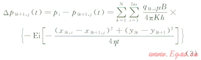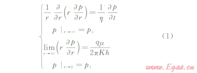 式中r為徑向距離,m;p為地層壓力,MPa;h為導(dǎo)壓系數(shù),m2·MPa/(mPa·s);h=K/(mcj);m為流體黏度,mPa·s;c為地層綜合壓縮系數(shù),MPa-1;t為生產(chǎn)時間,ks;pi為原始地層壓力,MPa;q為井產(chǎn)量,m3/ks;h為儲層厚度,m;K為巖石滲透率,D;j為孔隙度。