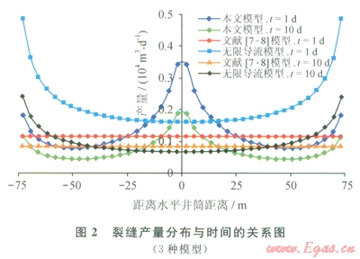 4)裂縫內(nèi)產(chǎn)量分布受生產(chǎn)時間和裂縫導(dǎo)流能力的影響,流動時間越長,裂縫導(dǎo)流能力越大,裂縫內(nèi)的產(chǎn)量分布越均勻。