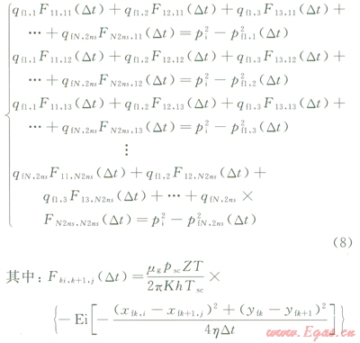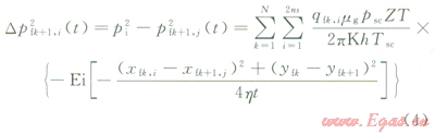 上面就完成了第一個Dt時間步長下各線匯單元及總產(chǎn)量計算;對于各線匯單元而言,由于產(chǎn)量會隨生產(chǎn)時間發(fā)生變化,這樣就需要利用時間疊加來求得任意時刻的值。設(shè)時間段步長為Dt,當(dāng)時t=mDt(第m個時間段的結(jié)尾),則對第k+1條裂縫的第j個線匯,可得到:
