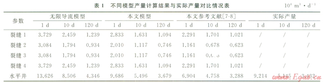 分別按照裂縫無限導(dǎo)流模型、本文模型以及本文參考文獻[7-8]的計算結(jié)果與實際產(chǎn)量對比(表1)??梢钥闯?,本文模型的計算結(jié)果從初期到穩(wěn)定生產(chǎn)階段最接近,表明本文模型準確性高。從3種模型計算結(jié)果的對比來看:無限導(dǎo)流模型計算生產(chǎn)ld時的產(chǎn)量為13.626×104m3/d、生產(chǎn)120d后產(chǎn)量為4.346×104m3/a,遠高于實際產(chǎn)量,表明不能忽略裂縫內(nèi)壓力損失的影響。從本文參考文獻[7-8]模型的計算結(jié)果與實際產(chǎn)量對比可以看出,生產(chǎn)初期差別較大(分別為6.904×104m3/a和9.214×104m3/d),而在生產(chǎn)120d的差別變小,這表明采用均勻產(chǎn)量分布的假設(shè)與實際情況存在較大偏差。