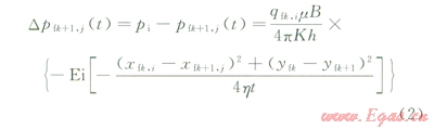 平面直角坐標(biāo)系下,設(shè)在裂縫k上有一線匯M(x2fk,i,ykf)(產(chǎn)量為qfk,i),在裂縫k+1上有一觀察點位于O(xfk+,j,yfk+1),線匯qfk,i連續(xù)生產(chǎn)時間t后在O點產(chǎn)生的壓力降落為: