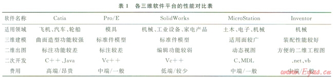 針對(duì)所要開發(fā)的系統(tǒng)功能要具有:①參數(shù)化的模型庫(kù);②模型庫(kù)設(shè)備的添加、瀏覽、刪除、編輯等;③自動(dòng)管路設(shè)計(jì);④材料表統(tǒng)計(jì);⑤自動(dòng)出圖;⑥有限元分析接口以及ROV的干涉檢測(cè)等。通過(guò)表l和圖l對(duì)Inventor、Catia、SolidWorks、Pro/E和Microstation等常用三維建模軟件平臺(tái)的用戶數(shù)量、適用領(lǐng)域、功能特點(diǎn)以及其經(jīng)濟(jì)性等數(shù)據(jù)進(jìn)行比較,最終選取了Autodesk Inventor作為水下生產(chǎn)虛擬仿真設(shè)計(jì)系統(tǒng)的開發(fā)平臺(tái)。