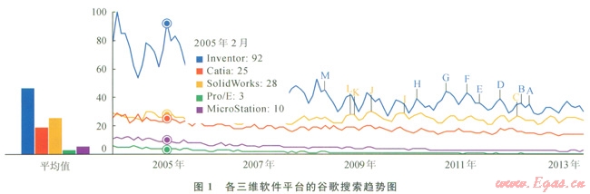 Inventor作為Autodesk公司推出的一款三維可視化軟件,具有三維建模、協(xié)同工作、信息管理和技術(shù)支持等強(qiáng)大功能,在該平臺(tái)可以實(shí)現(xiàn)創(chuàng)建三維模型、二維工程圖,其具有的連接網(wǎng)絡(luò)功能可以進(jìn)行同項(xiàng)目組員間的協(xié)同,為同項(xiàng)目組人員間數(shù)據(jù)共享和思想交流提供了極大方便。另外,通過(guò)谷歌趨勢(shì)檢索比較圖l,從另一個(gè)側(cè)面也反映出了該軟件具有更高的關(guān)注度和更大的應(yīng)用范圍。