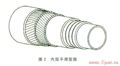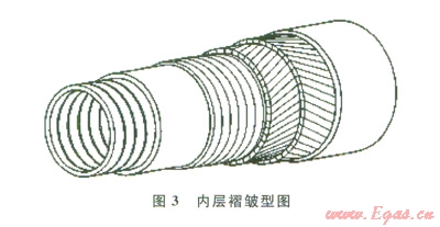 柔性管道主要分為兩種類型:內(nèi)層平滑型(圖2)和內(nèi)層褶皺型(圖3)。主要區(qū)別是:前者與介質(zhì)接觸的最內(nèi)層材料為塑性管道,而后者最內(nèi)層材料為金屬互鎖層。內(nèi)層褶皺型柔性管可以應用于油田和氣田,通球時不會對內(nèi)壁造成影響,而內(nèi)層平滑型應用于油田,氣田應用較少,在通球和管線內(nèi)出現(xiàn)真空工況時,需要避免外力對內(nèi)壁的破壞。除了最內(nèi)層的區(qū)別外,其他各層材料及功能都是相似的,
