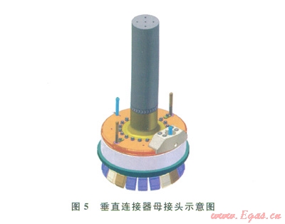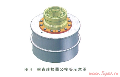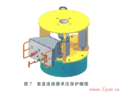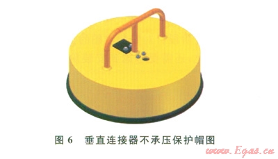 垂直連接器的公接頭一般安裝在管匯/采油樹上,母接頭裝在跨接管上、安裝時與公接頭對接(圖4、5)。水下連接器保護帽分為不承壓和承壓兩種形式(圖6、7)。不承壓保護帽對水下連接器的公接頭起到保護作用,也可隨著接頭安裝到水下,一般建議在水下的停留時間不超過42d。承壓保護帽可用于長期的公接頭保護(期限與公接頭使用壽命相同),根據(jù)密封形式的不同,也可用做隔斷使用,即橡膠密封的承壓保護帽可用作二級隔斷使用,金屬密封的承壓保護帽可用作一級隔斷使用。
