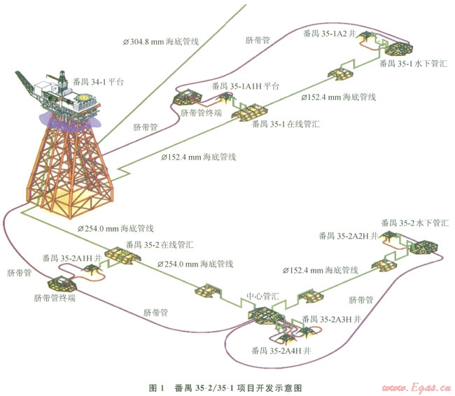 番禺35-2/35-l氣田位于中國南海北部,氣田所在海域水深為l90.2~338.0m。該項目氣田一期計劃開發(fā)6口氣井,采甩半潛式鉆井平臺鉆完井和后期修井與鉆調(diào)整井作業(yè),使用水下系統(tǒng)開發(fā)。生產(chǎn)的天然氣用海底管線輸往一個中心平臺后外輸陸地終端[1]。項目開發(fā)示意圖如圖1所示。