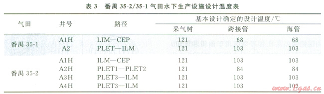 在基本設計過程中,對番禺35-2/35-1水下生產(chǎn)設施設計溫度確認(表3)。在詳細設計中,溫度的調(diào)整會導致水下設備(包括各類球閥和閘閥、水下連接器、水下管匯和水下采氣樹)及水下管線(生產(chǎn)管線和跨接管)設計的調(diào)整,不但影響項目后期的進度和費用,也會限制生產(chǎn)井的產(chǎn)能,從而不能按照預定配產(chǎn)進行生產(chǎn)。